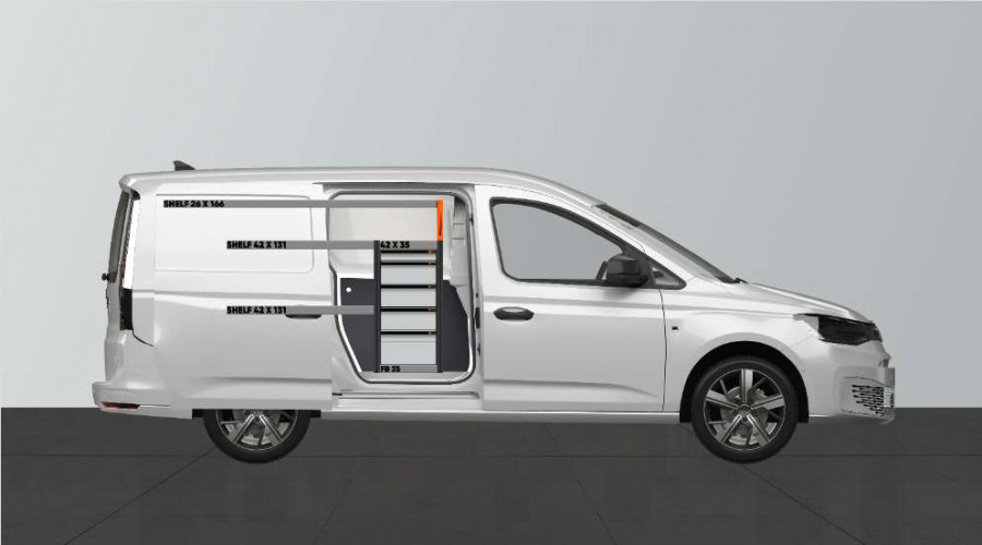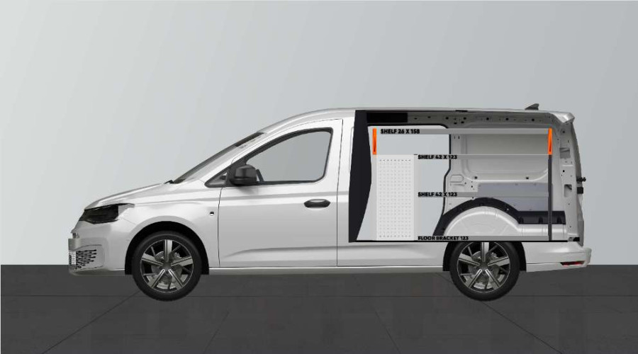 Dit is een van de populairste systemen voor de VW Caddy Cargo & Ford Connect L2 met een zijdeur aan de zijkant van de bedrijfswageninrichting. De bedrijfswageninrichting biedt goede opbergmogelijkheden voor zowel gereedschapstassen als machines en kleinere onderdelen. U krijgt een ladeblok met 5 laden in verschillende afmetingen, zodat alles zijn eigen plaats krijgt. Achter de laden is een gereedschapshouder aangebracht voor extra ophangmogelijkheden in de wagen. De laden op kogellagerschuifrails worden vaak aangevuld met onze nieuwe lade-inzetstukken en verdelers om een optimale structuur te creëren. Het aanvullen van het gereedschapsbord met onze smartbox is ook een populaire optie om de opbergruimte te optimaliseren.