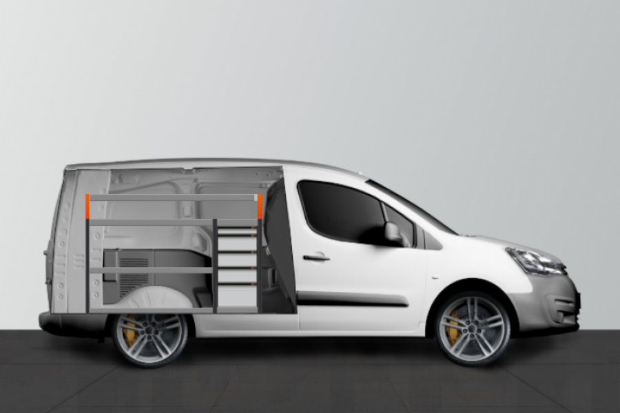 Bedrijfswageninrichting voor de linkerkant van uw Berlingo & Partner L2 met gemakkelijke toegang tot de lades vanaf de zijdeur.