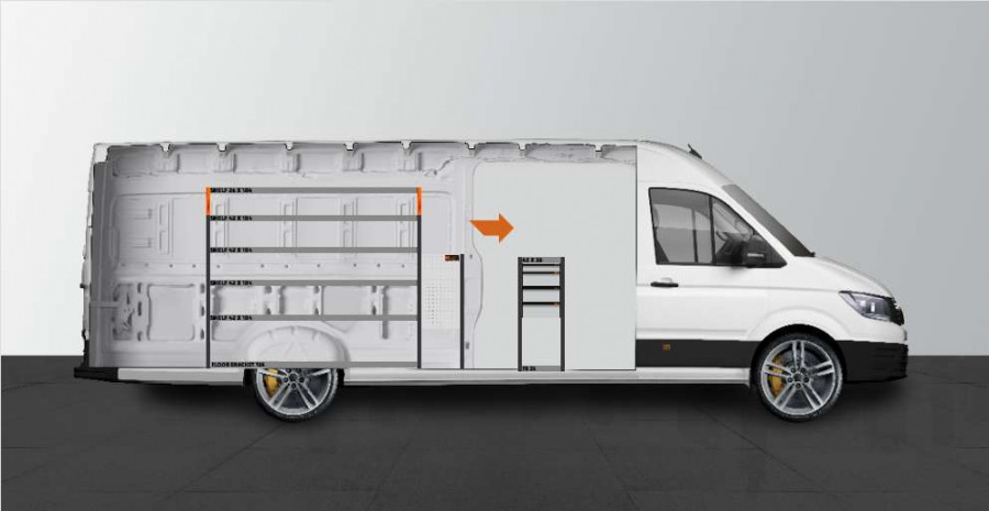 Een van de meest populaire inrichtingen voor uw MAN TGE & Volkswagen Crafter L5. De bedrijfswageninrichting biedt uiteenlopende opbergmogelijkheden, omdat de laden op de kogellagerschuifrails een handige toegang bieden via de zijdeur, terwijl de sleuven in de rijrichting kunnen worden uitgetrokken voor een beter overzicht. Deze kunnen worden aangevuld met ladeverdelers om zoveel mogelijk structuur te brengen in uw kleinere onderdelen. Onze diepe legplanken bieden ook goede opbergmogelijkheden voor gereedschapstassen en kleinere machines. Het verdeelde gewicht van de onderdelen in de laden op de kogellagerschuifrails is 35 kg/stuk. De binnenafmetingen van de laden zijn (mm) B-308, D-387, H-60 en H-130.