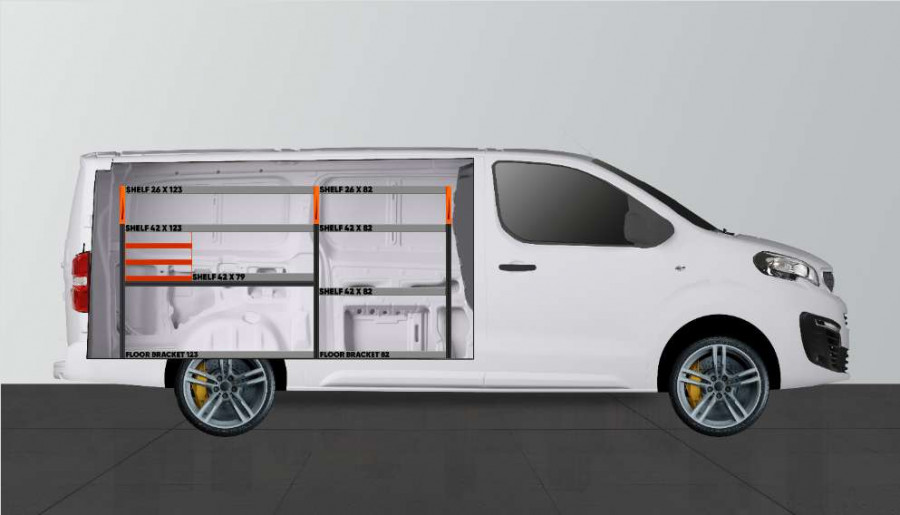 Met een combinatie van laden en legplanken is dit een zeer populaire bedrijfswageninrichting die geschikt is voor Expert, Jumpy, Vivaro, Scudo & ProAce L2