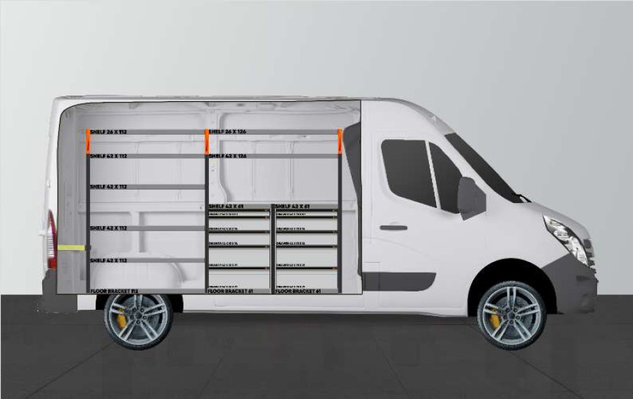 Bent u op zoek naar een bedrijfswageninrichting met veel laden? Stelt u ook hoge eisen aan uw bedrijfswageninrichting? Dan is dit de perfecte optie voor u en uw Opel Movano, Renault Master & Nissan NV400. De bedrijfswageninrichting biedt goede opbergmogelijkheden voor zowel gereedschapstassen als machines en kleinere onderdelen. In totaal worden 10 laden op kogellagerschuifrails meegeleverd. U krijgt ook een ladeblok met laden in verschillende afmetingen, zodat alles zijn plaats krijgt. Een populaire aanvulling van de laden op kogellagerschuifrails zijn onze lade-inzetstukken en verdelers om een optimale structuur te creëren.