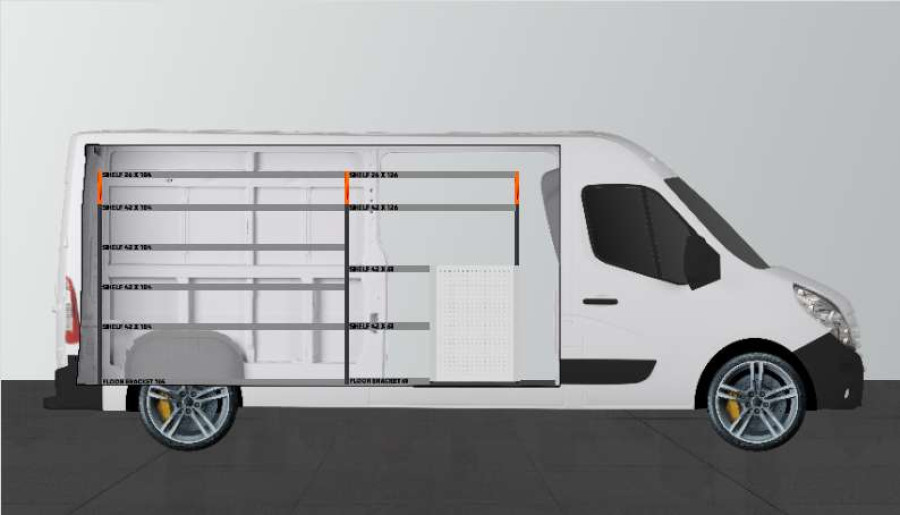 Dit is een van de populairste systemen voor de Opel Movano, Renault Master & Nissan NV400 L3 met een zijdeur aan de zijkant van de bedrijfswageninrichting. De bedrijfswageninrichting biedt goede opbergmogelijkheden voor zowel gereedschapstassen als machines en kleinere onderdelen. U krijgt een ladeblok met 5 laden in verschillende afmetingen, zodat alles zijn eigen plaats krijgt. Achter de laden is een gereedschapshouder aangebracht voor extra ophangmogelijkheden in de wagen. De laden op kogellagerschuifrails worden vaak aangevuld met onze nieuwe lade-inzetstukken en verdelers om een optimale structuur te creëren. Het aanvullen van het gereedschapsbord met onze smartbox is ook een populaire optie om de opbergruimte te optimaliseren.