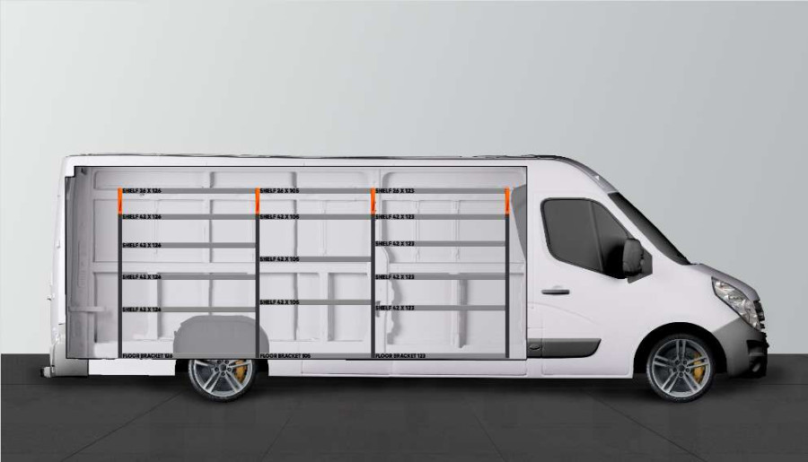 De V-Basic bedrijfswageninrichting voor de linkerzijde van de Movano, Master & NV400, is Ideaal voor wie graag een basisstellingssysteem met planken wenst.