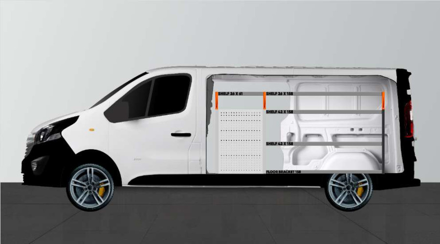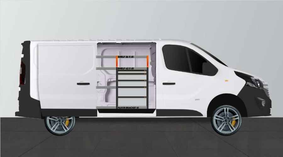 Dit is een van de populairste systemen voor de Nissan NV300, Renault Trafic & Fiat Talento L2 met een zijdeur aan de zijkant van de bedrijfswageninrichting. De bedrijfswageninrichting biedt goede opbergmogelijkheden voor zowel gereedschapstassen als machines en kleinere onderdelen. U krijgt een ladeblok met 5 laden in verschillende afmetingen, zodat alles zijn eigen plaats krijgt. Achter de laden is een gereedschapshouder aangebracht voor extra ophangmogelijkheden in de wagen. De laden op kogellagerschuifrails worden vaak aangevuld met onze nieuwe lade-inzetstukken en verdelers om een optimale structuur te creëren. Het aanvullen van het gereedschapsbord met onze smartbox is ook een populaire optie om de opbergruimte te optimaliseren.