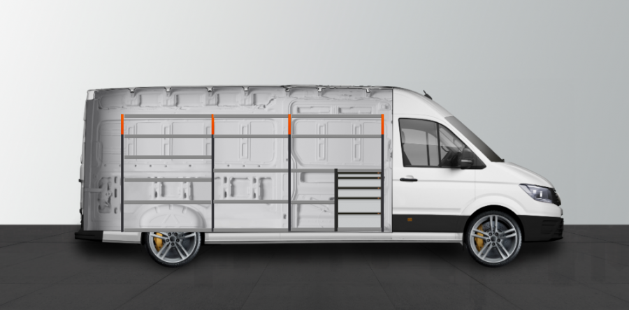 De V-PRO is een bedrijfswageninrichting met veel ruimte in de schappen om gereedschap op te bergen. De 5 lades worden efficiënt gemonteerd zodat ze gemakkelijk via de zijdeur bereikt kunnen worden. Het laadgewicht van de lades op kogellager rails is 35kg/st. De binnenmaat van de lades is (mm) B-579, D-387, H-60, H-130 en H-200, deze kunnen optioneel aangevuld worden met onze assortimentsinleggers voor de beste indeling. Dit product is op maat gemaakt voor de linkerkant van de Mercedes Sprinter Standard L3H2 en kan uitgebreid worden met ons nieuwe Smartbox systeem om de oplsagcapaciteit maximaal te benutten.