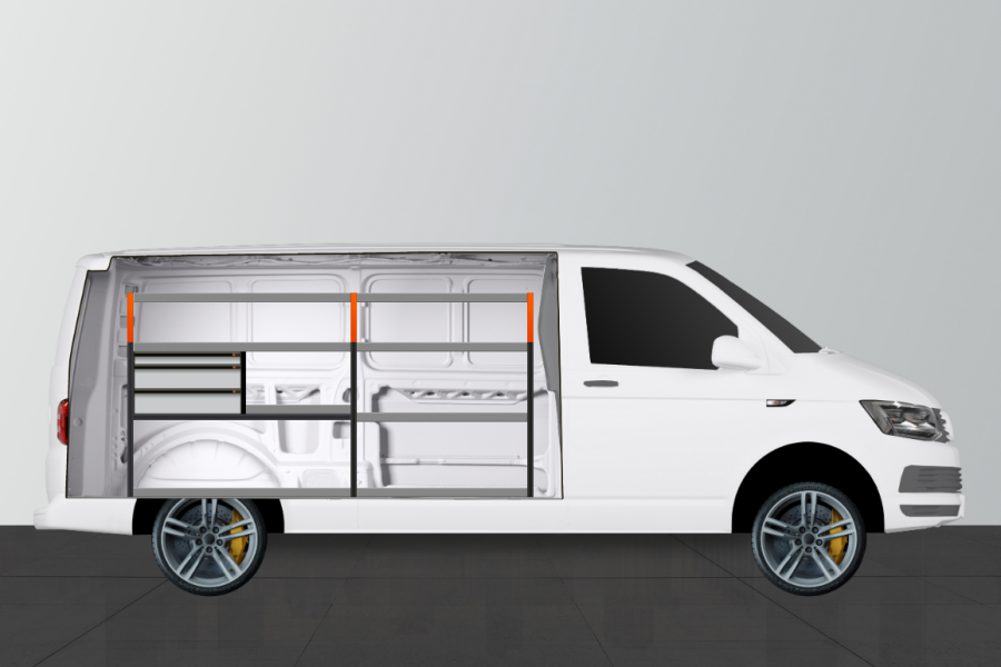 Populaire bedrijfswageninrichting voor de linkerkant van uw VW Transporter L2 met veel opbergmogelijkheden en lades.