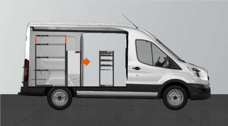Een van de meest populaire inrichtingen voor uw Ford Transit L2H2. De bedrijfswageninrichting biedt uiteenlopende opbergmogelijkheden, omdat de laden op de kogellagerschuifrails een handige toegang bieden via de zijdeur, terwijl de sleuven in de rijrichting kunnen worden uitgetrokken voor een beter overzicht. Deze kunnen worden aangevuld met ladeverdelers om zoveel mogelijk structuur te brengen in uw kleinere onderdelen. Onze diepe legplanken bieden ook goede opbergmogelijkheden voor gereedschapstassen en kleinere machines. Het verdeelde gewicht van de onderdelen in de laden op de kogellagerschuifrails is 35 kg/stuk. De binnenafmetingen van de laden zijn (mm) B-308, D-387, H-60 en H-130.