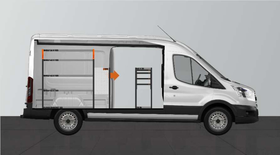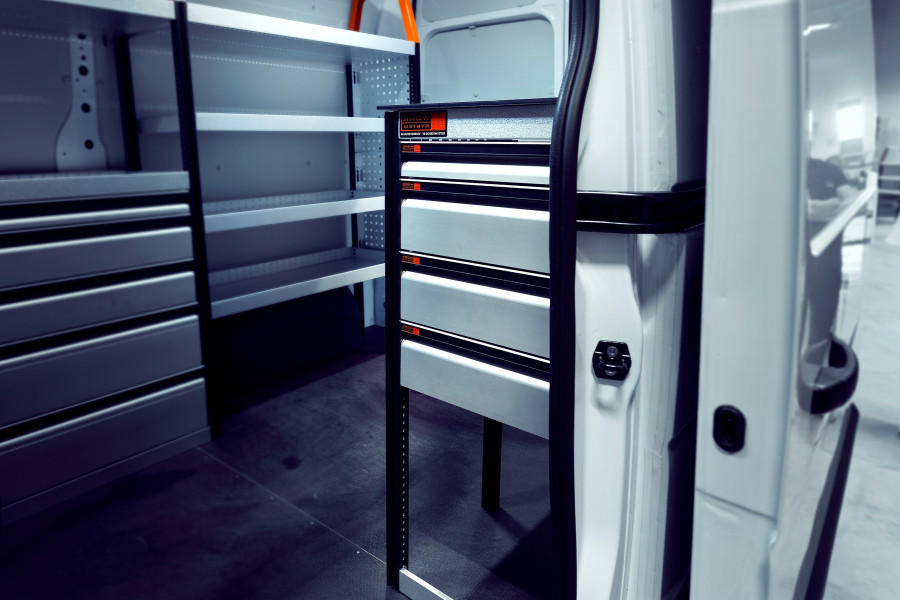 Een van de meest populaire inrichtingen voor uw Ford Transit L3H2. De bedrijfswageninrichting biedt uiteenlopende opbergmogelijkheden, omdat de laden op de kogellagerschuifrails een handige toegang bieden via de zijdeur, terwijl de sleuven in de rijrichting kunnen worden uitgetrokken voor een beter overzicht. Deze kunnen worden aangevuld met ladeverdelers om zoveel mogelijk structuur te brengen in uw kleinere onderdelen. Onze diepe legplanken bieden ook goede opbergmogelijkheden voor gereedschapstassen en kleinere machines. Het verdeelde gewicht van de onderdelen in de laden op de kogellagerschuifrails is 35 kg/stuk. De binnenafmetingen van de laden zijn (mm) B-308, D-387, H-60 en H-130.