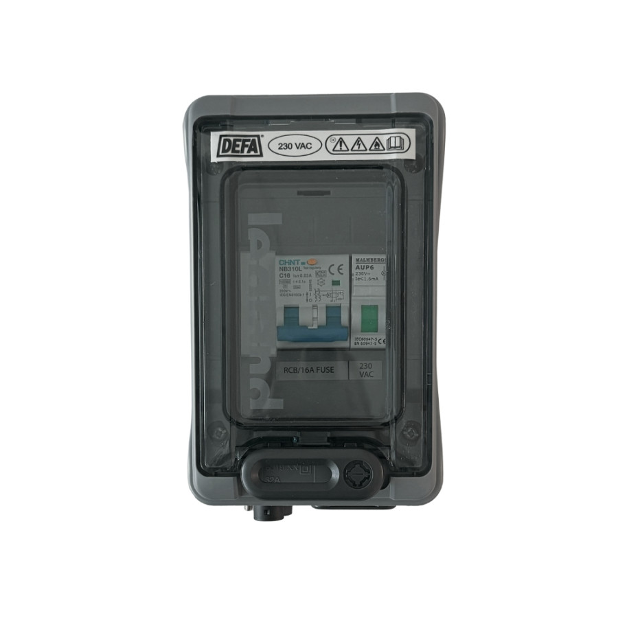Verdeelkast met zekering en aardlekschakelaar. Deze verdeelkast wordt standaard geleverd met een Schuko (standaard stopcontact) als uitgang en DEFA-stekkers voor in- en uitvoer. Het station is bedoeld voor 230 V AC, 16A-zekering. De verdeelkast bevat een 'sink saver' die de galvanische corrosie van metalen in schepen vermindert.