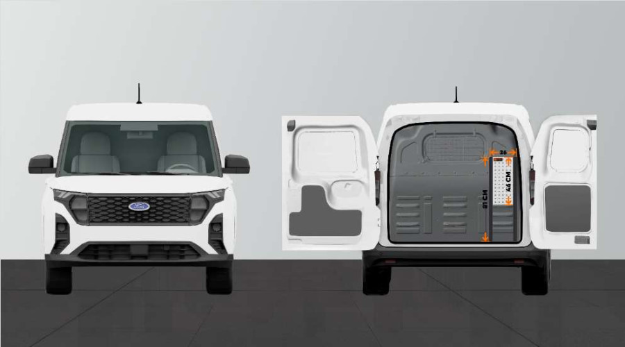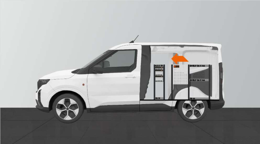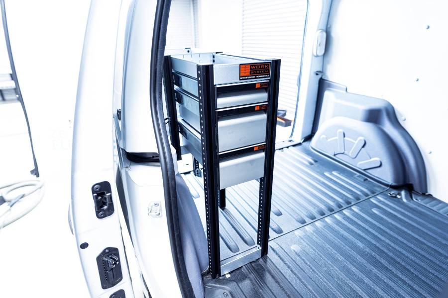 Eine Fahrzeugeinrichtung mit leicht zugänglichen Schubladen für reibungsloses Arbeiten im Ford Courier L1.