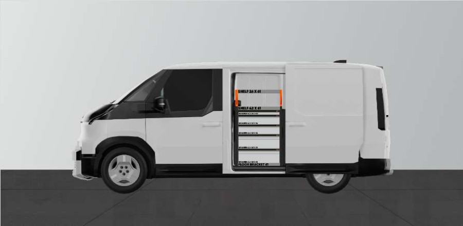 Mit dieser Fahrzeugeinrichtung erhalten Sie viel Stauraum in Regalen und Schubladen, geeignet für den Kia PV5 L2H1 .