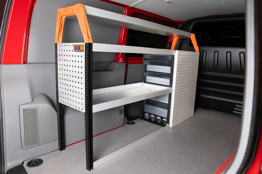 Mit der Serie Work System V-LS3 bieten wir Ihnen ein Fahrzeugregal für den Ford Custom L1, bestehend aus einem Regal mit drei Schubladen, ausgestattet mit Kugellagerschienen.