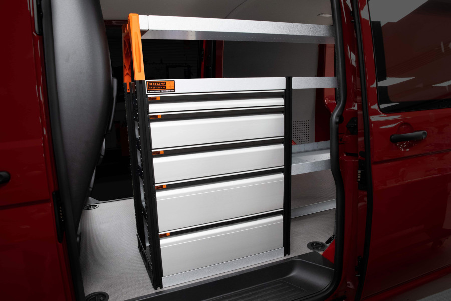 Dies ist eines der beliebtesten Systeme für den Kia PV5 L2H1 mit Seitentür auf der Seite der Einrichtung. Die Einrichtung bietet gute Aufbewahrungsmöglichkeiten für Werkzeugtaschen/-koffer, Maschinen und Kleinteile. Sie umfasst eine Schubladeneinheit mit 5 Schubladen in verschiedenen Größen, damit jeder Ausrüstungsgegenstand seinen Platz erhält. Hinter den Schubladen befindet sich eine Werkzeugtafel, die zusätzliche Aufhängungsmöglichkeiten im Fahrzeug bietet. Die Schubladen auf Kugellagerschienen werden häufig durch unsere neuen Schubladeneinsätze und Trennwände ergänzt, um maximale Ordnung und Übersichtlichkeit zu gewährleisten. Die Regalwand wird gerne auch durch unsere Smartboxen ergänzt, um den Stauraum zu maximieren.