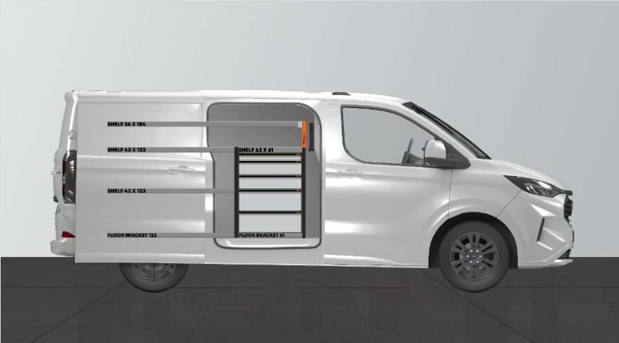 Dies ist eines der beliebtesten Systeme für den Ford Custom & VW Transporter l1 mit Seitentür auf der Seite der Einrichtung. Die Einrichtung bietet gute Aufbewahrungsmöglichkeiten für Werkzeugtaschen/-koffer, Maschinen und Kleinteile. Sie umfasst eine Schubladeneinheit mit 5 Schubladen in verschiedenen Größen, damit jeder Ausrüstungsgegenstand seinen Platz erhält. Hinter den Schubladen befindet sich eine Werkzeugtafel, die zusätzliche Aufhängungsmöglichkeiten im Fahrzeug bietet. Die Schubladen auf Kugellagerschienen werden häufig durch unsere neuen Schubladeneinsätze und Trennwände ergänzt, um maximale Ordnung und Übersichtlichkeit zu gewährleisten. Die Regalwand wird gerne auch durch unsere Smartboxen ergänzt, um den Stauraum zu maximieren.