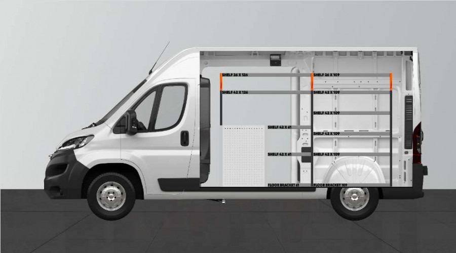 Dies ist eines der beliebtesten Systeme für den Proace Max, Peugeot Boxer, Fiat Ducato, Citroen Jumper 2010- & Opel Movano 2021- L2 mit Seitentür auf der Seite der Einrichtung. Die Einrichtung bietet gute Aufbewahrungsmöglichkeiten für Werkzeugtaschen/-koffer, Maschinen und Kleinteile. Sie umfasst eine Schubladeneinheit mit 5 Schubladen in verschiedenen Größen, damit jeder Ausrüstungsgegenstand seinen Platz erhält. Hinter den Schubladen befindet sich eine Werkzeugtafel, die zusätzliche Aufhängungsmöglichkeiten im Fahrzeug bietet. Die Schubladen auf Kugellagerschienen werden häufig durch unsere neuen Schubladeneinsätze und Trennwände ergänzt, um maximale Ordnung und Übersichtlichkeit zu gewährleisten. Die Regalwand wird gerne auch durch unsere Smartboxen ergänzt, um den Stauraum zu maximieren.