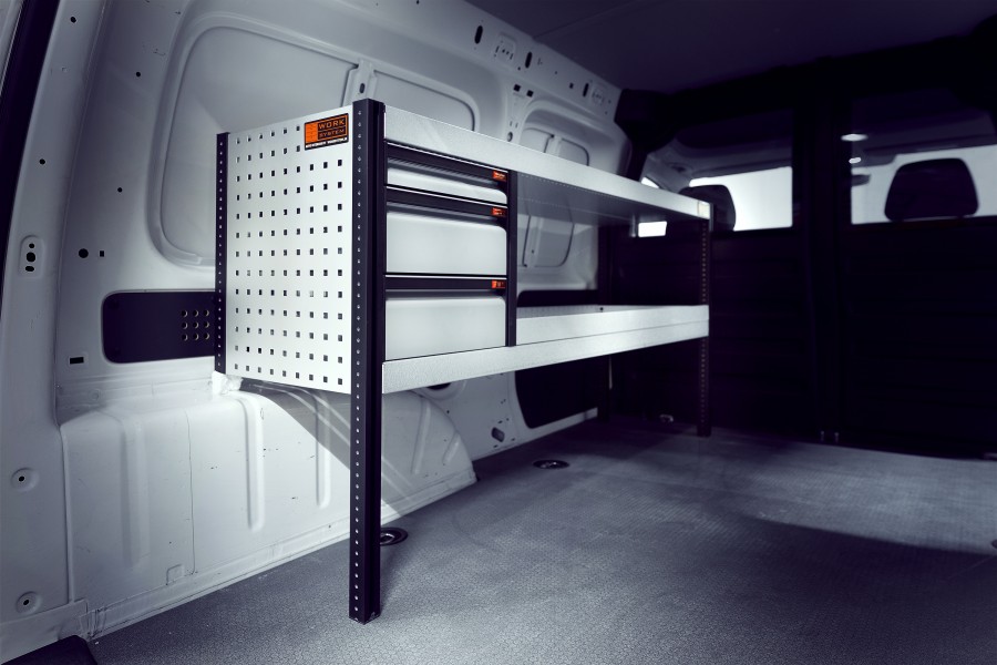 Mit der Serie Work System V-LS3 bieten wir Ihnen ein Fahrzeugregal für Berlingo, Combo, Proace City & Partner L2, bestehend aus einem Regal mit drei Schubladen, ausgestattet mit Kugellagerschienen.