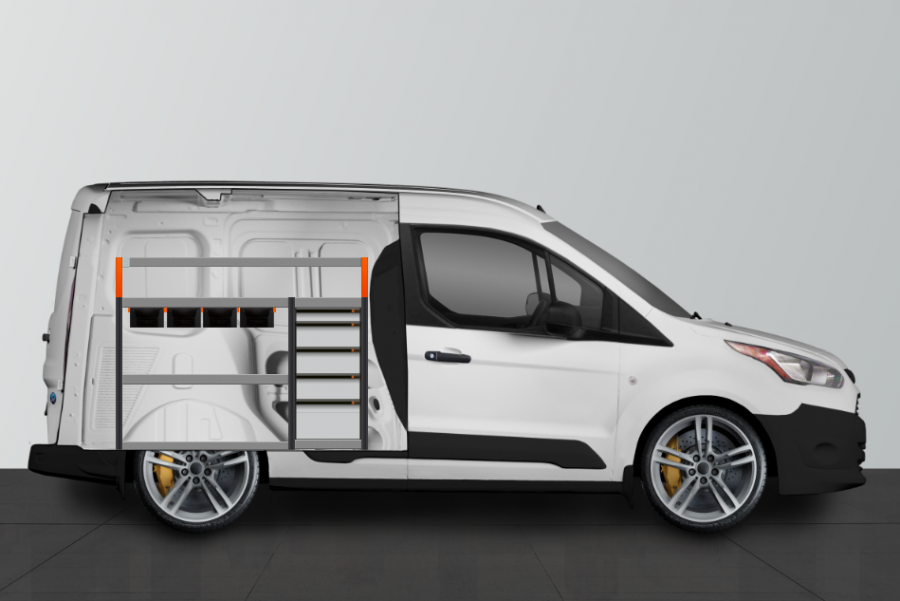 Ein V-PRO Regal mit ausziehbaren Modulboxen zum unterhängen für Ihren Ford Connect L1.