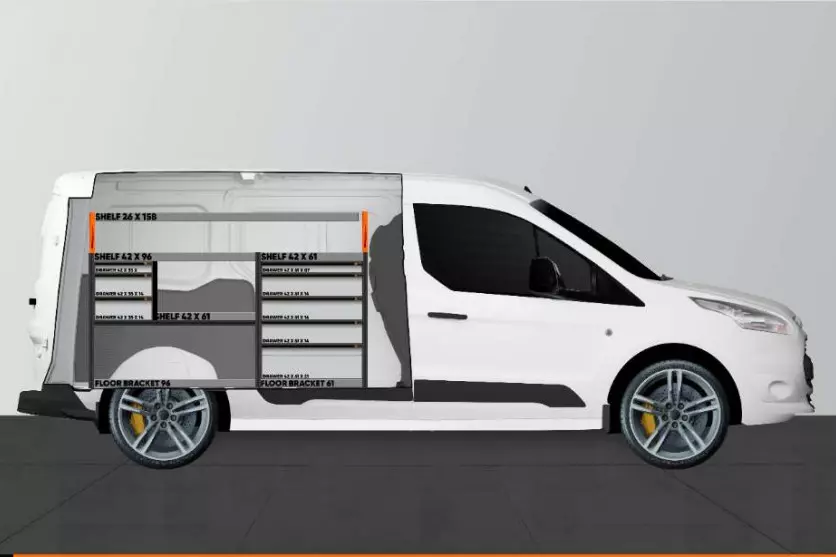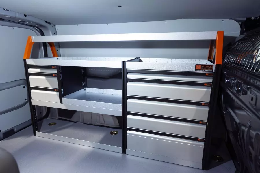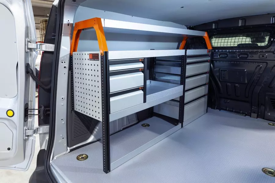 Fahrzeugeinrichtung mit vielen Schubladen, die viel Stauraum für Ihren Ford Connect L2 bieten.
