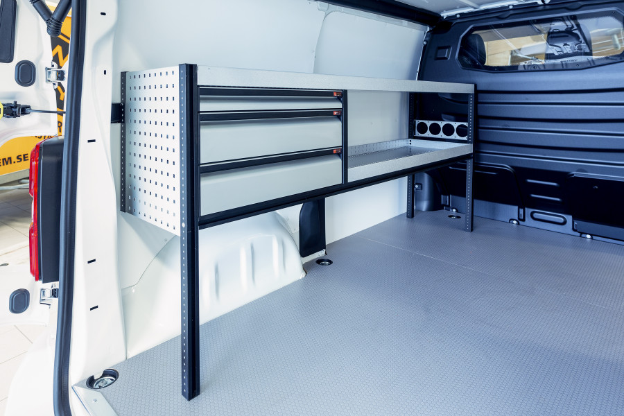 Mit der Serie Work System V-LS3 bieten wir Ihnen ein Fahrzeugregal für Berlingo, Combo, Proace City & Partner L2, bestehend aus einem Regal mit drei Schubladen, ausgestattet mit Kugellagerschienen.