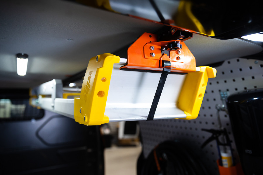 Der Leiterhalter wird an der Decke im Fahrzeug montiert, um Ladefläche auf dem Boden einzusparen.