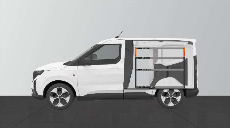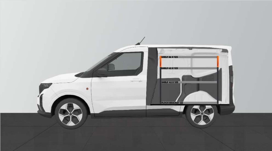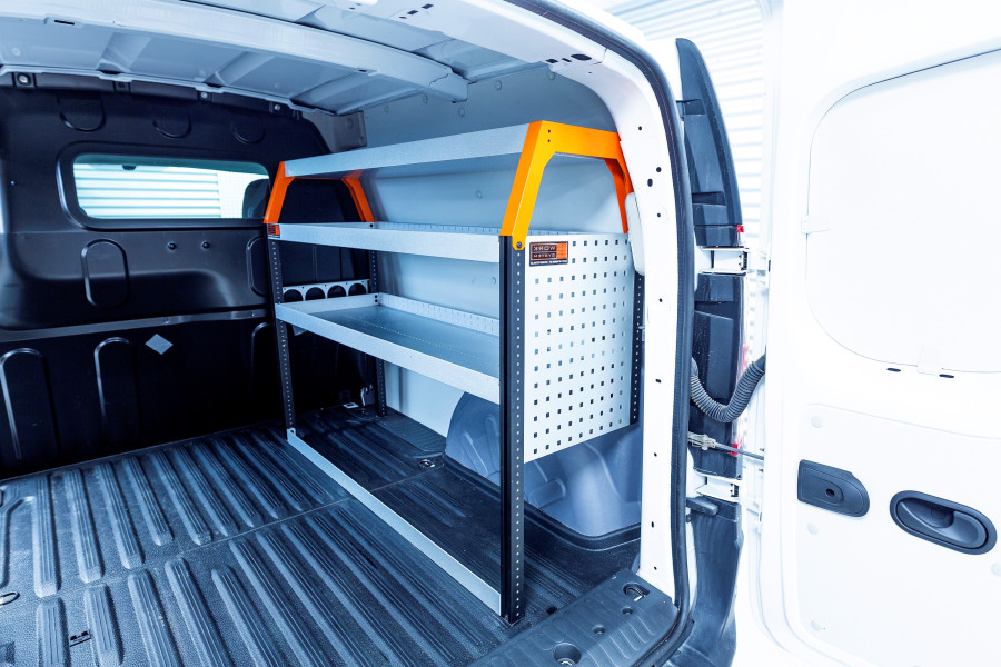 Avec une profondeur de 420 mm, cet aménagement offre d’excellentes possibilités de rangement pour votre Ford Courier L1. Les étagères de 420 mm de profondeur permettent d’accueillir parfaitement la plupart des mallettes à outils actuellement disponibles sur le marché. L’étagère du haut de 262,5 mm est souvent combinée à nos bacs modulaires pour y ranger les petits objets. L’aménagement est adapté aux véhicules avec ou sans porte latérale et le panneau perforé latéral peut être équipé de nos accessoires Smartbox, crochets, etc.