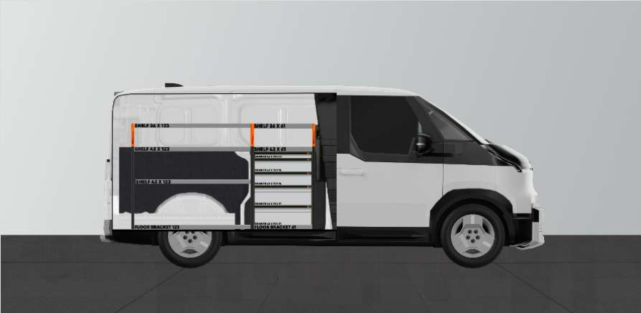 Cet aménagement offre un grand espace de rangement (tiroirs et étagères) pour KIA PV5 L2H1 avec porte latérale gauche.