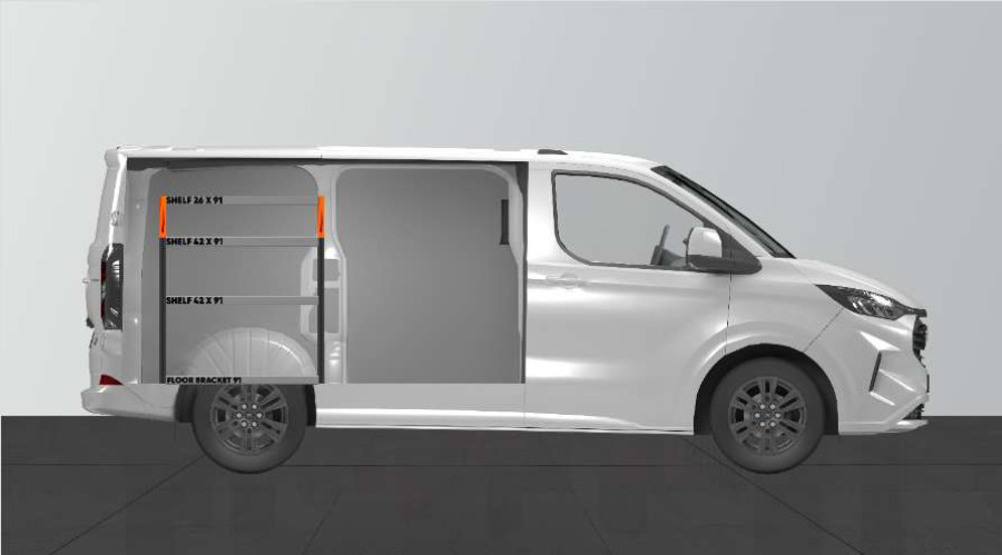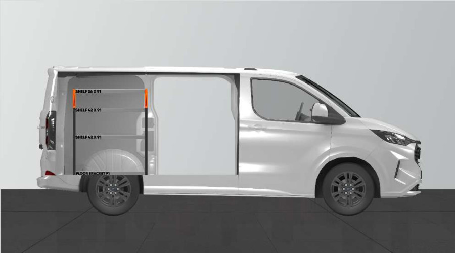 Un aménagement utilitaire un peu plus court pour votre Ford Custom & VW Transporter L1. Avec une profondeur de 420 mm l’aménagement constitue une excellente alternative de rangement pour les mallettes à outils et les outils électriques ainsi que pour les petites pièces. Les étagères de 420 mm de profondeur permettent d’accueillir parfaitement la plupart des mallettes à outils actuellement disponibles sur le marché. L’étagère du haut de 262,5 mm est souvent combinée à nos bacs modulaires pour y ranger les petits objets. L’aménagement est adapté aux véhicules avec ou sans porte latérale et le panneau perforé peut être équipé de nos accessoires Smartbox, crochets, etc.