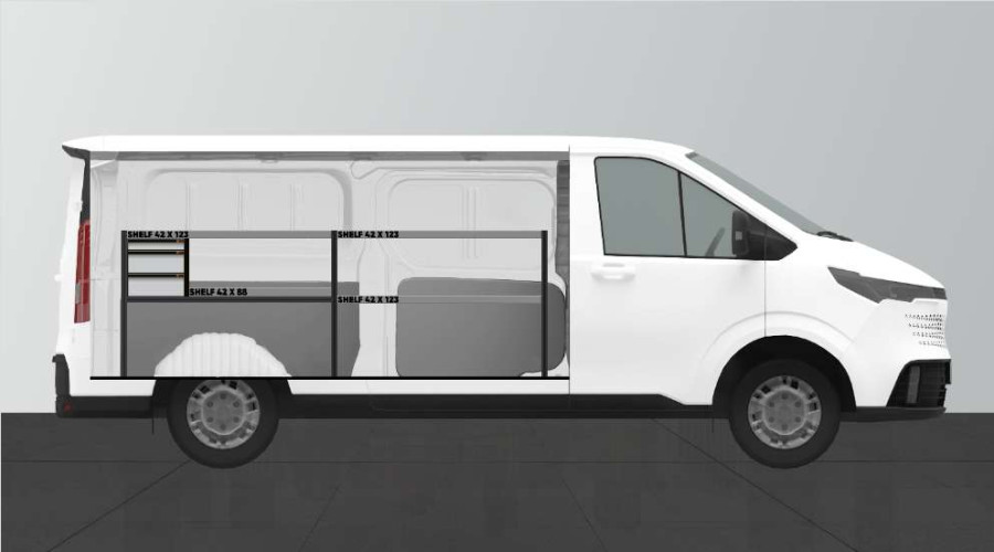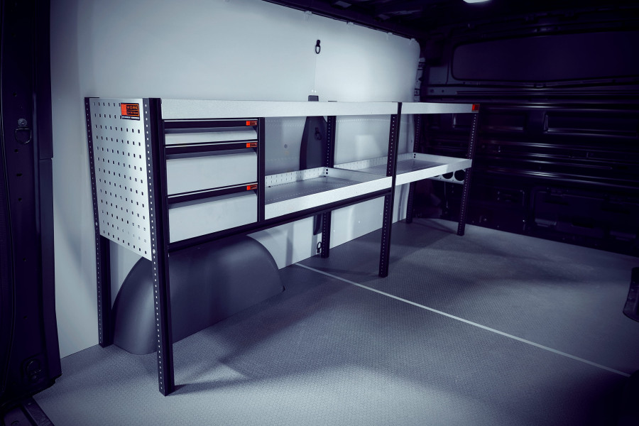 Une solution économique pour ceux qui recherchent un aménagement combinant tiroirs avec glissières à billes et étagères pour leur MAXUS E-DELIVER 7 L2. Les étagères de 420 mm de profondeur permettent d’accueillir parfaitement la plupart des mallettes à outils actuellement disponibles sur le marché. Les tiroirs peuvent être complétés par nos inserts à tiroir qui permettent de bien ranger les petits objets.