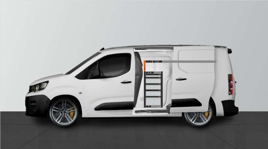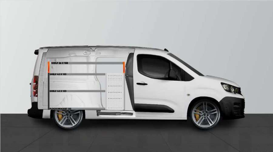 Voici l’un de nos systèmes les plus appréciés des conducteurs de Citroën Berlingo, Opel Combo, Fiat Doblo Toyota Proace City & Peugeot Partner L2. Le chiffre 5 correspond au nombre de tiroirs. Cet aménagement offre également d’excellentes possibilités de rangement dans les étagères, non seulement pour vos mallettes à outils et vos outils électriques mais aussi pour vos petits objets. Vous disposez d’un bloc à tiroirs qui est tourné vers l’ouverture de la porte latérale. À l’arrière du bloc à tiroirs se trouve un panneau perforé pour augmenter les possibilités d’accrocher du matériel. Les tiroirs avec roulement à billes peuvent être complétés par nos inserts à tiroir pour structurer l’espace de façon optimale. Le panneau perforé peut être équipé de nos accessoires Smartbox, crochets, etc. afin d’optimiser votre espace de rangement.