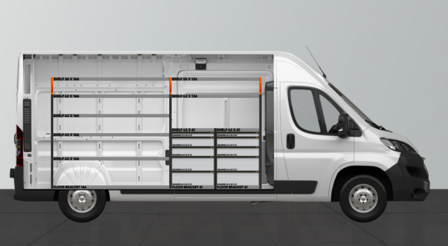 L’aménagement V-PRO est conçu pour le côté gauche de votre véhicule utilitaire. Il est doté de plusieurs tiroirs ainsi que de plusieurs étagères pouvant être complétées. Cet équipement pour utilitaire est conçu pour Proace Max, Peugeot Boxer, Fiat Ducato et Citroën Jumper L3H2