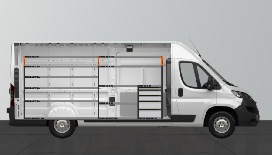 Med denna bilinredning får du mycket förvaring i både hyllor och lådor passande Proace Max, Peugeot Boxer och Citroen Jumper L4H2