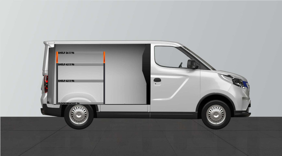 Un aménagement utilitaire un peu plus court pour votre Maxus e-Deliver 3 L1. Avec une profondeur de 420 mm l’aménagement constitue une excellente alternative de rangement pour les mallettes à outils et les outils électriques ainsi que pour les petites pièces. Les étagères de 420 mm de profondeur permettent d’accueillir parfaitement la plupart des mallettes à outils actuellement disponibles sur le marché. L’étagère du haut de 262,5 mm est souvent combinée à nos bacs modulaires pour y ranger les petits objets. L’aménagement est adapté aux véhicules avec ou sans porte latérale et le panneau perforé peut être équipé de nos accessoires Smartbox, crochets, etc.