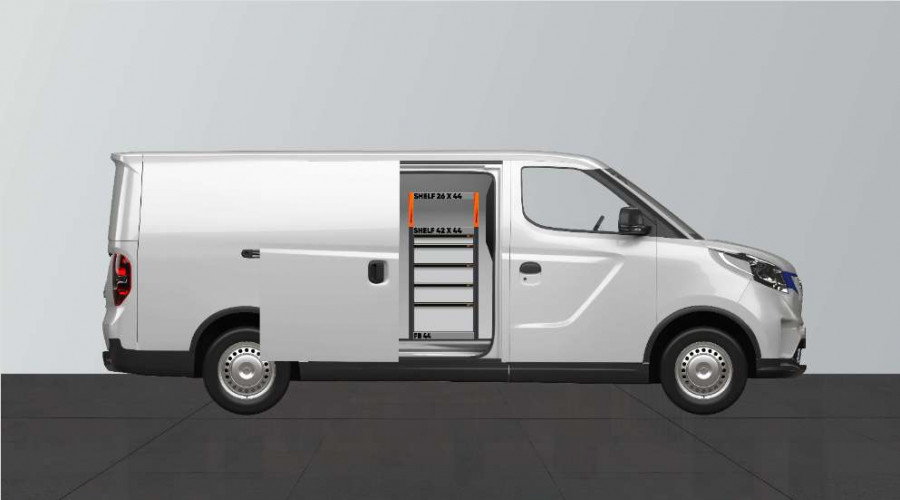 Voici l’un de nos systèmes les plus appréciés des conducteurs de Maxus e-Deliver 3 L2. Le chiffre 5 correspond au nombre de tiroirs. Cet aménagement offre également d’excellentes possibilités de rangement dans les étagères, non seulement pour vos mallettes à outils et vos outils électriques mais aussi pour vos petits objets. Vous disposez d’un bloc à tiroirs qui est tourné vers l’ouverture de la porte latérale. À l’arrière du bloc à tiroirs se trouve un panneau perforé pour augmenter les possibilités d’accrocher du matériel. Les tiroirs avec roulement à billes peuvent être complétés par nos inserts à tiroir pour structurer l’espace de façon optimale. Le panneau perforé peut être équipé de nos accessoires Smartbox, crochets, etc. afin d’optimiser votre espace de rangement.