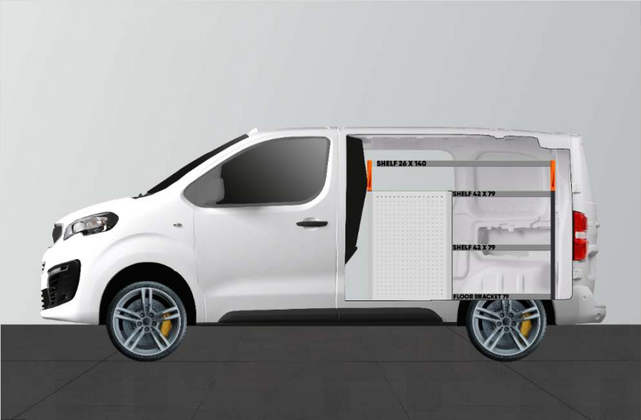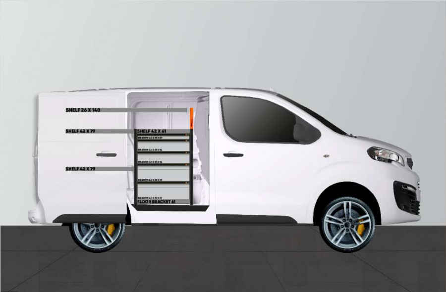 Cet aménagement offre un grand espace de rangement (tiroirs et étagères) pour Expert, Jumpy, Vivaro, Scudo & ProAce L1 avec porte latérale gauche. (Retour/échange exclus)